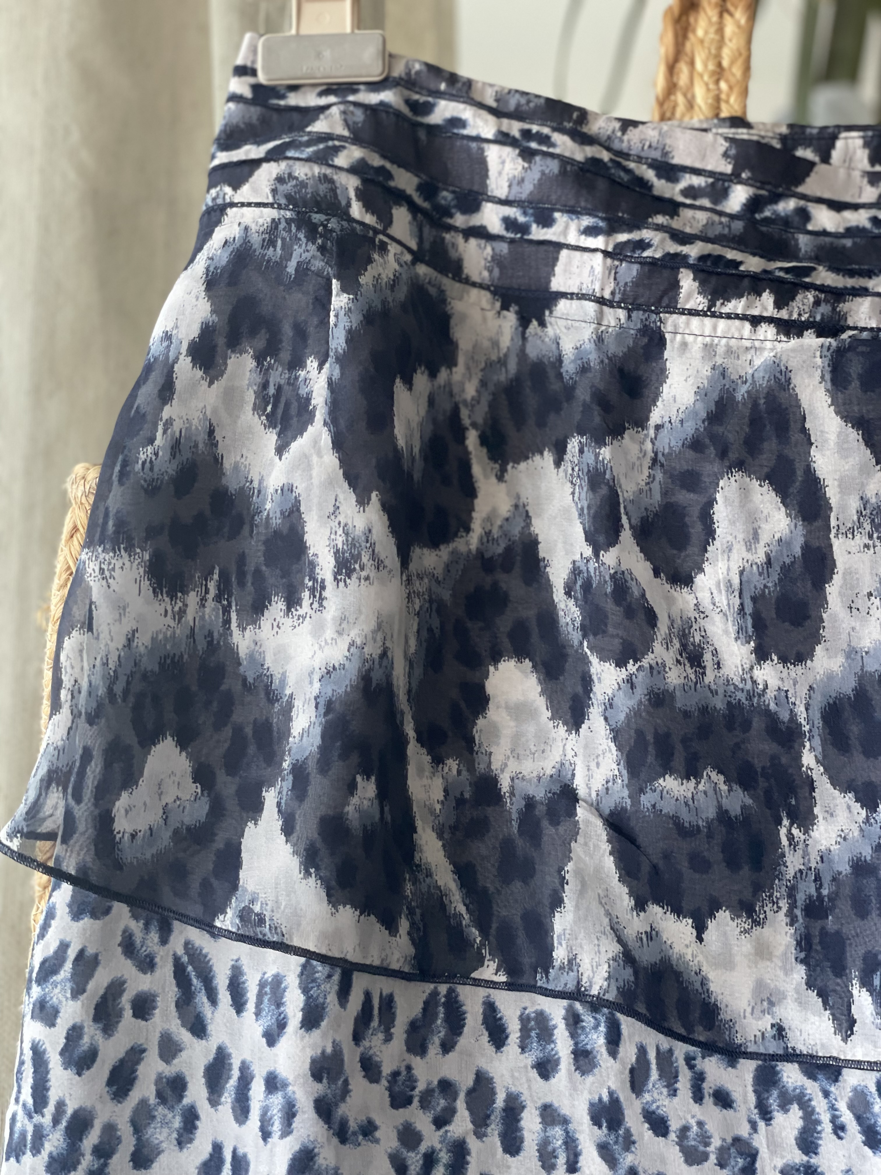 Fusta animal print cu volane din #matase naturala, in tonuri de bleu si griuri