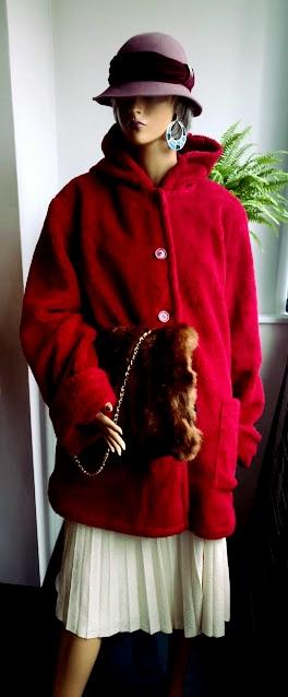Haina cu gluga,din blana eco,Teddy bear .pufoasa,moale ,fluida !Culoare rosu burgundy.Este captusita,are doua buzunare,se inchide cu nasturi pana sus.Pe interior are doua snururi laterale,care pot strange haina in talie,daca se doreste.